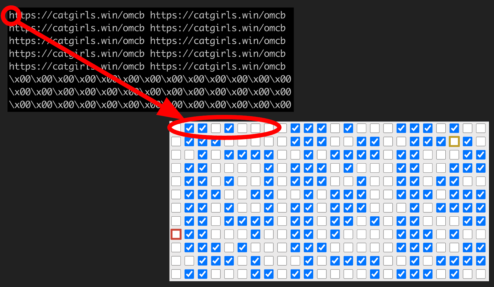 For no real reason, one day Royalty dumped the raw data as ASCII encoding. However, the bits (0 for unchecked, 1 for checked) could be read as text, and when he looked, he found a web address encoded in the checkboxes. Someone had written a message in binary using bots, and every time Royalty unchecked the boxes they would immediately get switched back. The message was persistent. It led to a Discord server.