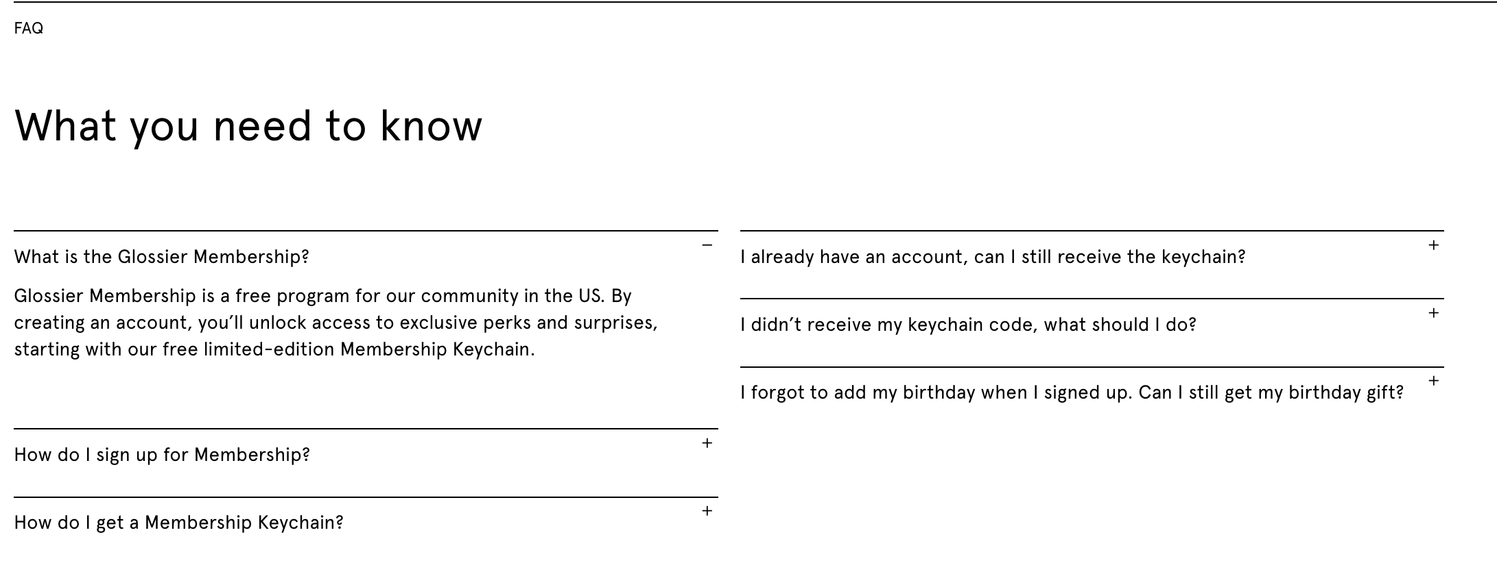 The FAQ mentions a free keychain in four of the six questions. A keychain. This is what Glossier believes membership is built on. And then there are unnamed perks and surprises.